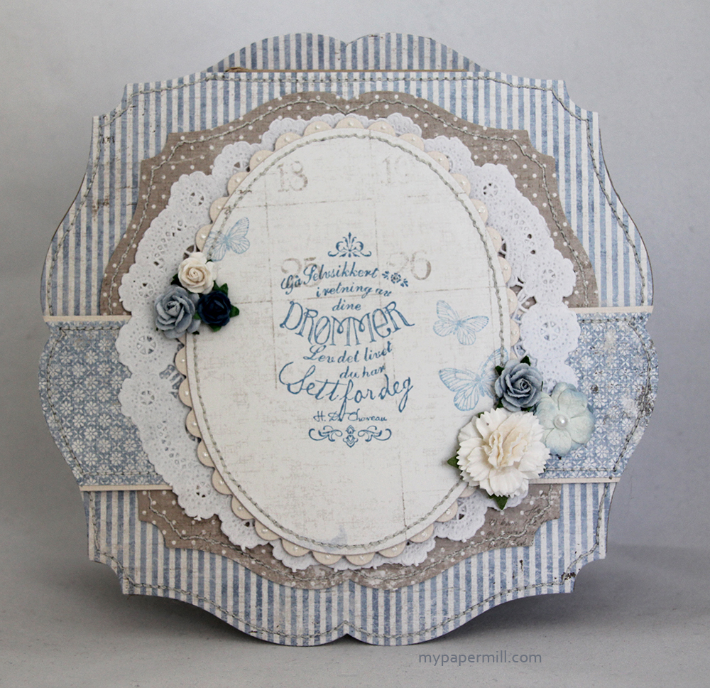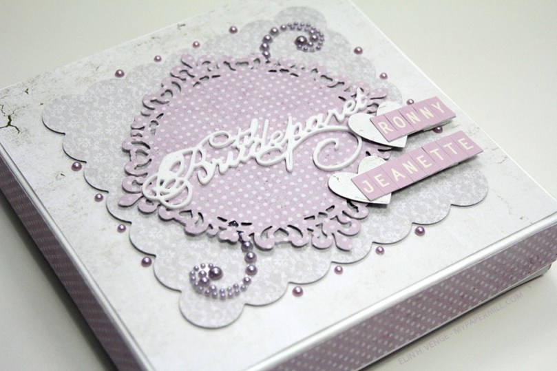 På toppen av esken har jeg brukt papirer fra begge de nye seriene (Dagen er din og Velkommen lille venn), og jeg har satt flesteparten av dem på 3D-puter for å få litt dimensjon (som om esken ikke er høy nok i utgangspunktet). Jeg har pyntet med perler og swirls, og stanset ut en tekstdie med mosegummi. Dieen kommer med skygge, men jeg har valgt å ikke bruke skyggen, jeg syns uttrykket blir renere uten.