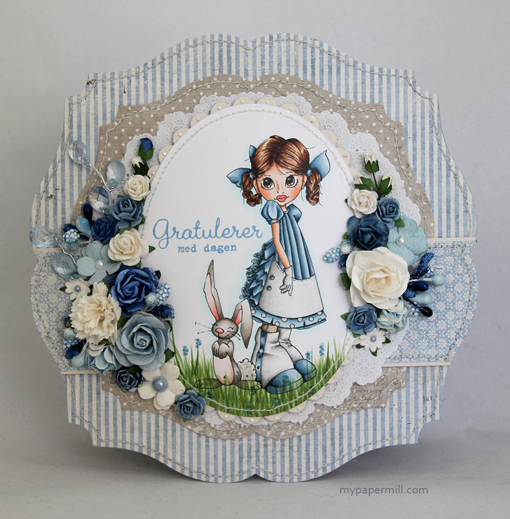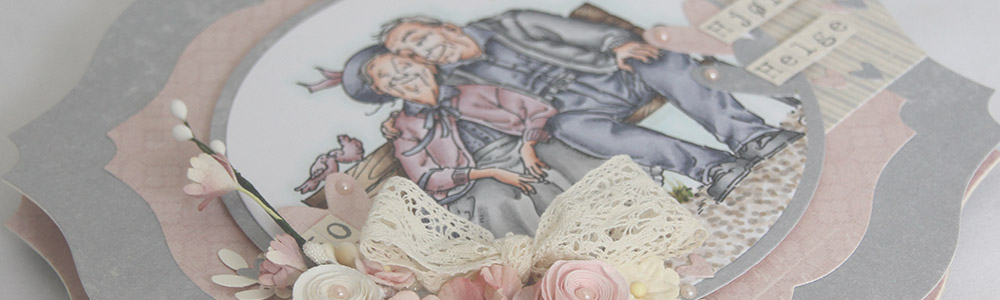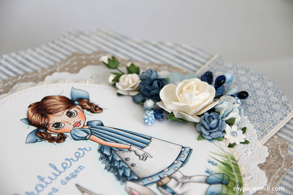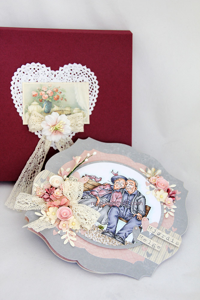 I used the same papers inside as on the outside, just in the opposite layout. The die I used for the base is so large that you only get one base from a sheet of patterned paper, and since I didn’t have four sheets of the steel blue paper, I had to resort to pink on the insides. A little variation never hurt. The paper with the flower pattern is the back of the striped paper from the front. I stamped a heart from Stempelglede’s Grunge Flourish Hearts stamp set using Hero Arts Soft Granite Shadow ink and stamped a North Star Design sentiment on top using Memento Tuxedo Black. I also embellished with flowers, pearls, berry head stamens and hearts. The little postage stamps on the top right were a perfect fit, the couple’s daughter (the one who ordered the card) is giving her parents a cake as a present.