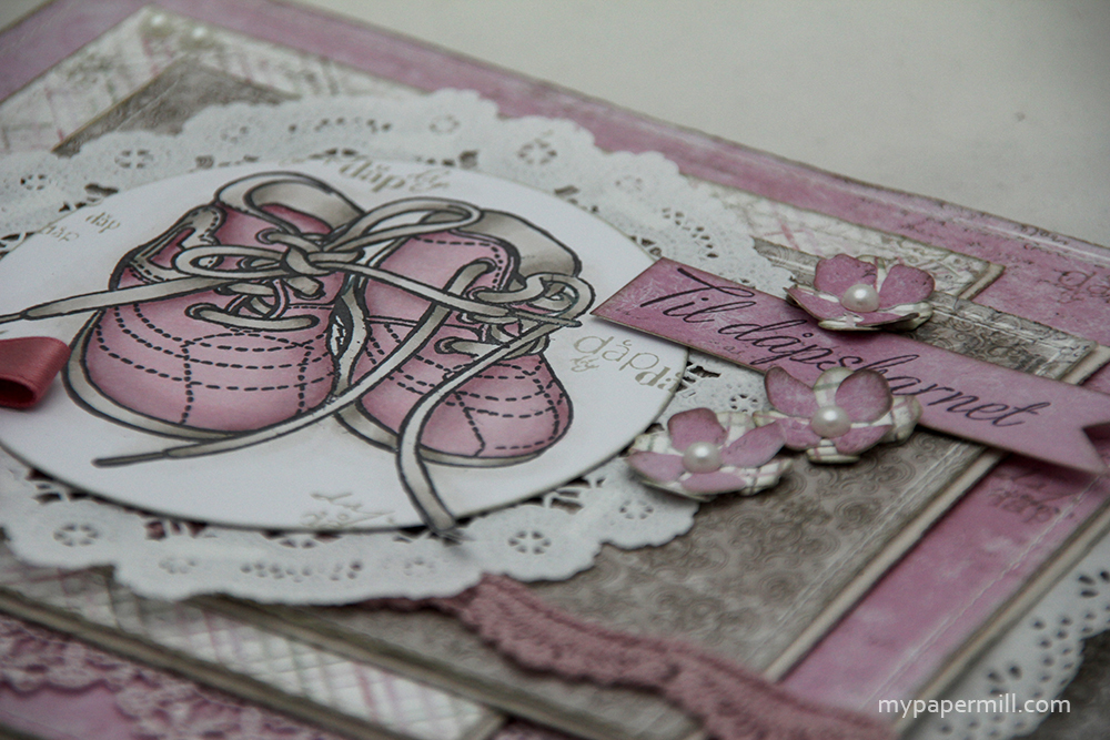 There’s something about me and flowers, I just can’t help myself. I used a mix of different ones here. I found a pink Prima flower that I’ve had for aaaaaaages that fit the pink in the patterned paper perfectly. I added some flowers and some old pink and creme berry head stamens from Kort & Godt (the really old berry head stamens from Kort & Godt have a beautiful creme color to them, not like the new ones, that are more green-ish) and mini sweetheart blossoms and other flowers from North Star Design. I punched some leafy branches with an EK Success punch and added lots of tiny Kaisercraft pearls. I also added a bow from a piece of lace I had in my stash.