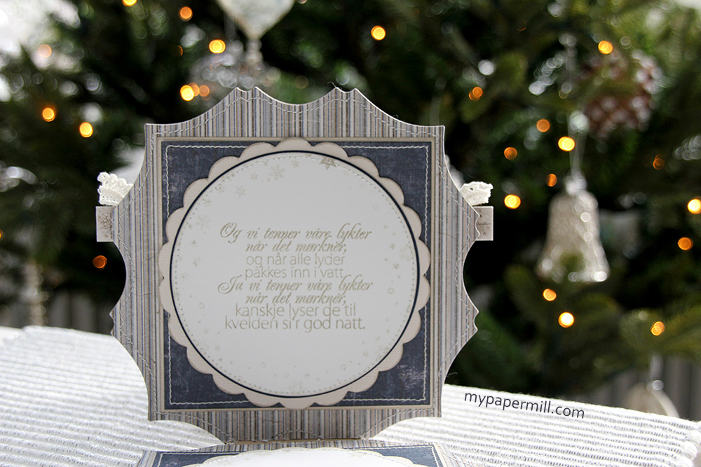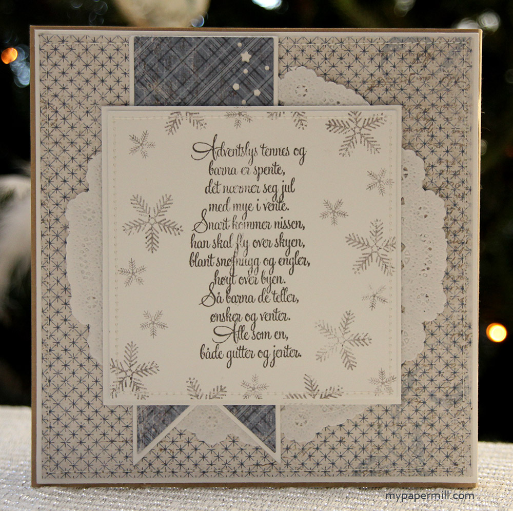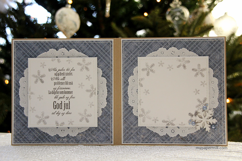 Nissepar inniInnsidene har jeg laget meget enkle. Teksten fra North Star er stemplet med Memento Espresso Truffle – og selv om bildet av stempelet i nettbutikken viser en å/og-feil, er ikke den på selve stempelet. Snøkrystallene jeg har stemplet rundt er faktisk i samme farge, men annengangsstemplet.