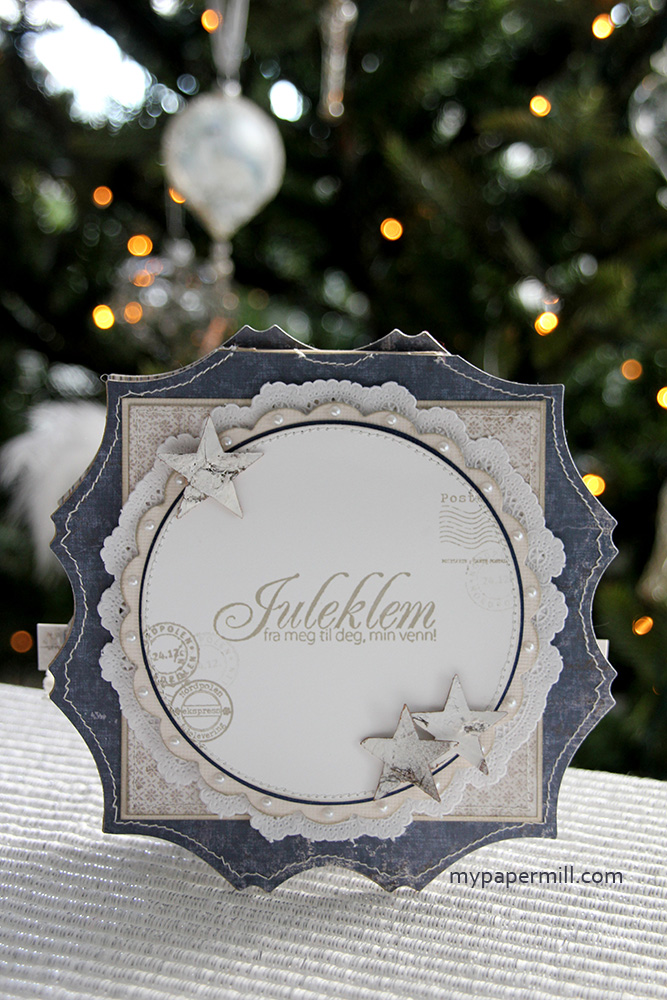 Nissepar frontMotivet Hr. og Fru Julenisse kommer fra North Star og er som vanlig med mine motiver farget med Copics. Arkene 12th of December og 15th of December pryder forsiden, det ene stanset ut med Notched Star Banner-die fra Papertrey Ink. Ellers har jeg brukt en kakeserviett, Bazzill Kraft og Classic Smooth White og chipboardsnøfnugg fra Maya Road malt hvite og med glitter på. God Jul kommer fra denne stempelplaten, stempelet er stemplet først, så stanset ut med en 1″ sirkelpunch som jeg har lagt en 1″ pebble med litt glitter oppå. De blå perlene kommer fra Kaisercraft.