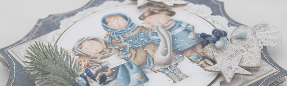 The card is also my inspiration contribution on Mo’s Clubhouse blog today. I colored Carolers Three with no lines, added snowflakes with a white Pilot pen, diecut the image with a circle die and sewed around the edge. Like the first card, I used paper from Maja Design – on this one I used 16th of December from the Vintage Frost Basics line, No. XXI from the Vintage Autumn Basics line and 6th of March from the Vintage Spring Basics line. The shape of the card is made using a GoKreate die.