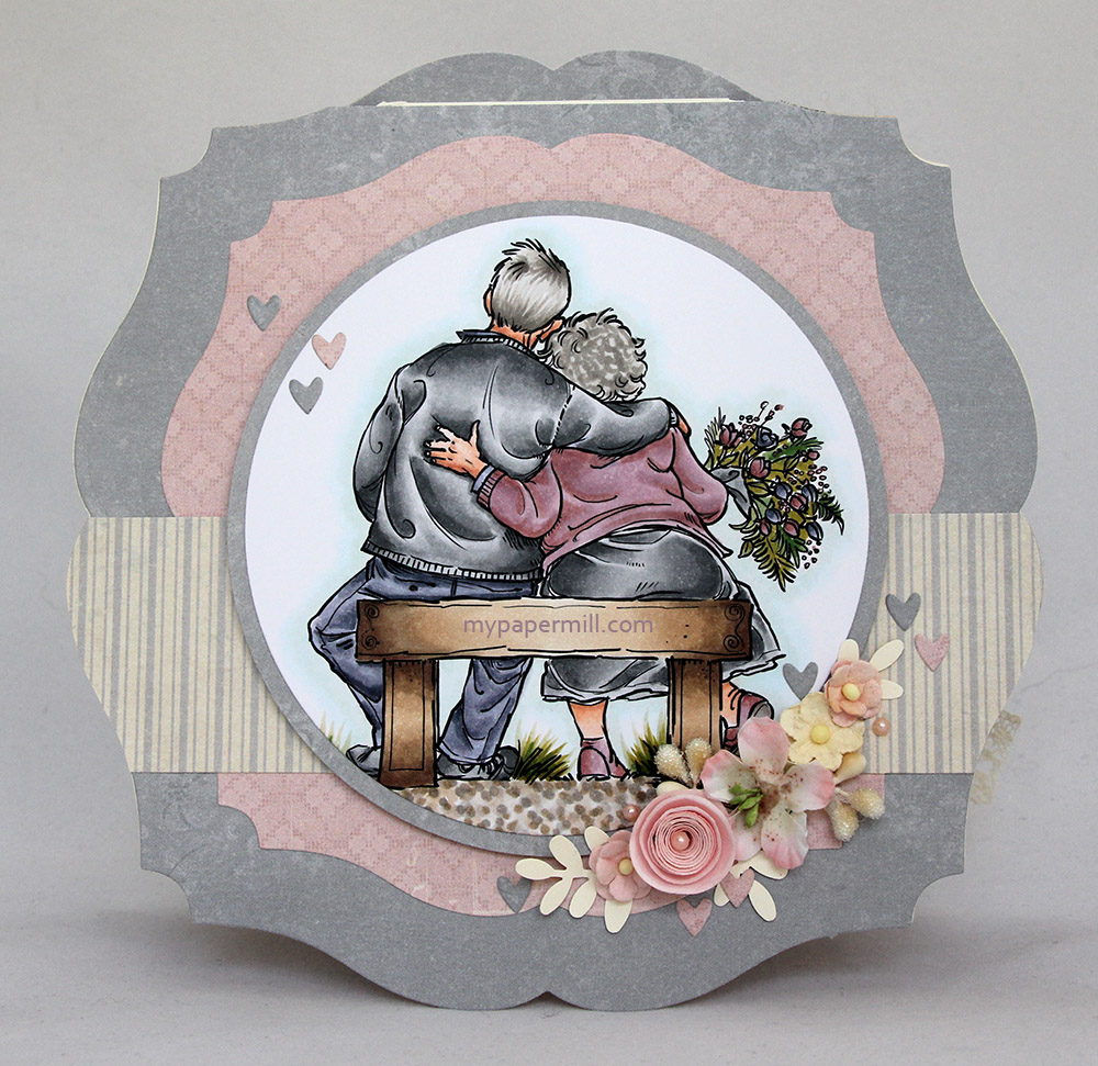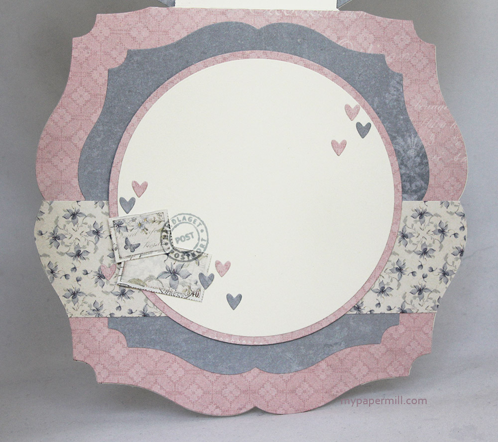 I chose Young Love this time and papers from the For Mother collection from Pion Design. The shape of the card is made using the second largest die in the GoKreate XXL Square Frames Frilly #10 set. I diecut the image with a Lifestyle Crafts circle die, put in on a circular mat from patterned paper and popped it up on foam dots. I used the Tremendous Tags die from Papertrey to diecut all the heart – the three “large” ones and all the tiny ones. The die diecuts a little hole at the top right of the larger hearts, but I diecut them without using a machine, so I was able to avoid the holes. Cheating is totally allowed!
