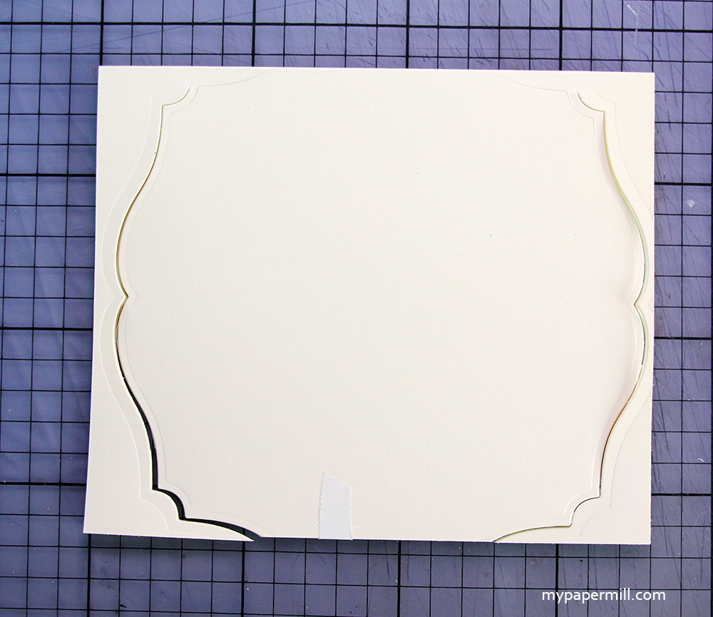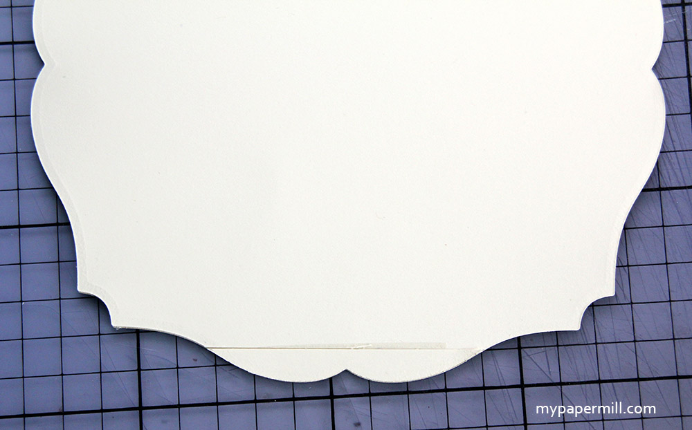 I start with the cardstock I’m going to use. The color doesn’t really matter, most of it will be covered by patterned paper anyway. This piece measures 12 x 7″, I adjust the size according to what die I use to make the card. As with all of my cards I make 1/4″ spine, and score at 5-7/8 and 6-1/8″.