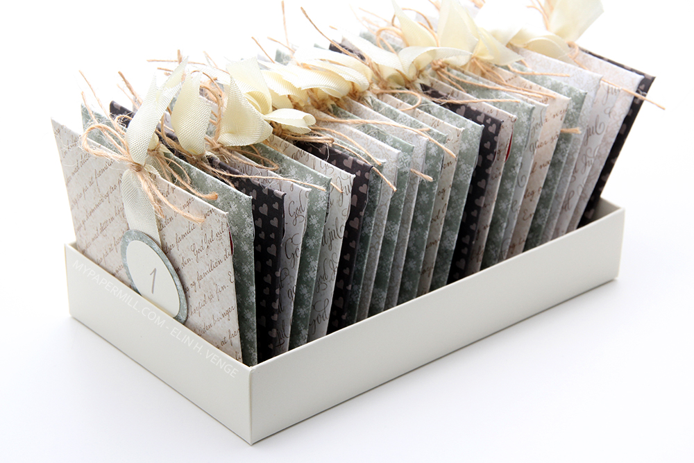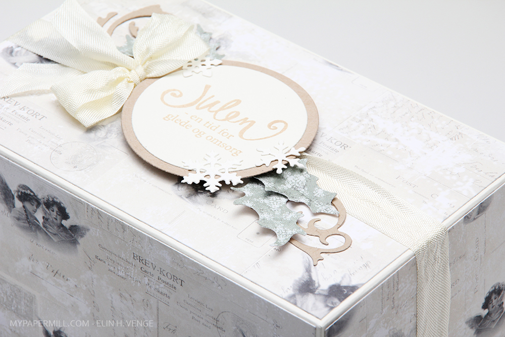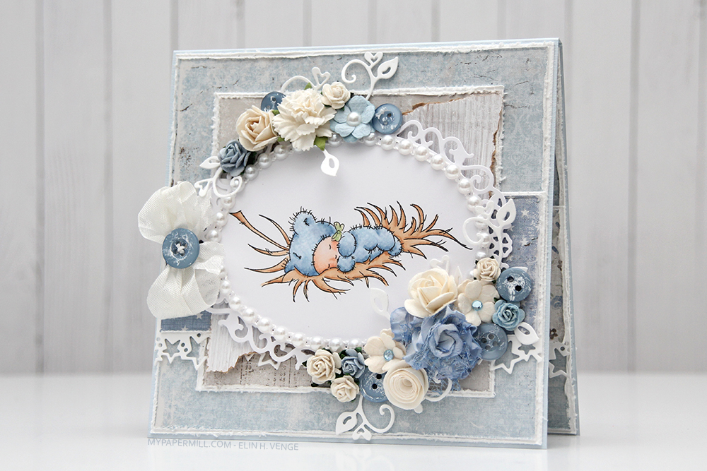 I used lots of foam tape for dimension, and varying widths of the patterned paper layered and criss-crossed across the card. I used the Slimline Starter die set from My Favorite Things and also the Stitched Trad. Tag STAX dies to create the tags. The reinforcers are made with the Tag Builder Blueprints 6 die set, also from MFT.