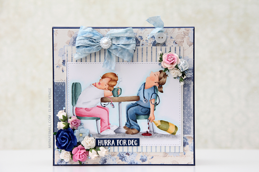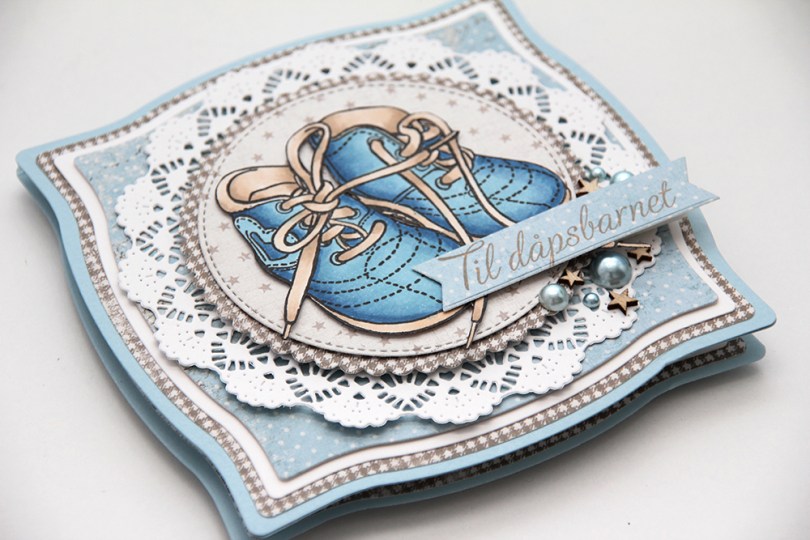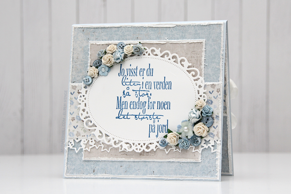 On the back of the card I used more patterned paper, more fussy cut footballs and also a sentiment from Norsk Stempelblad AS stamped in Memento Ladybug ink.
