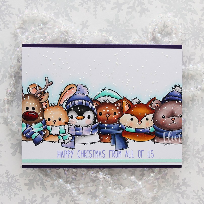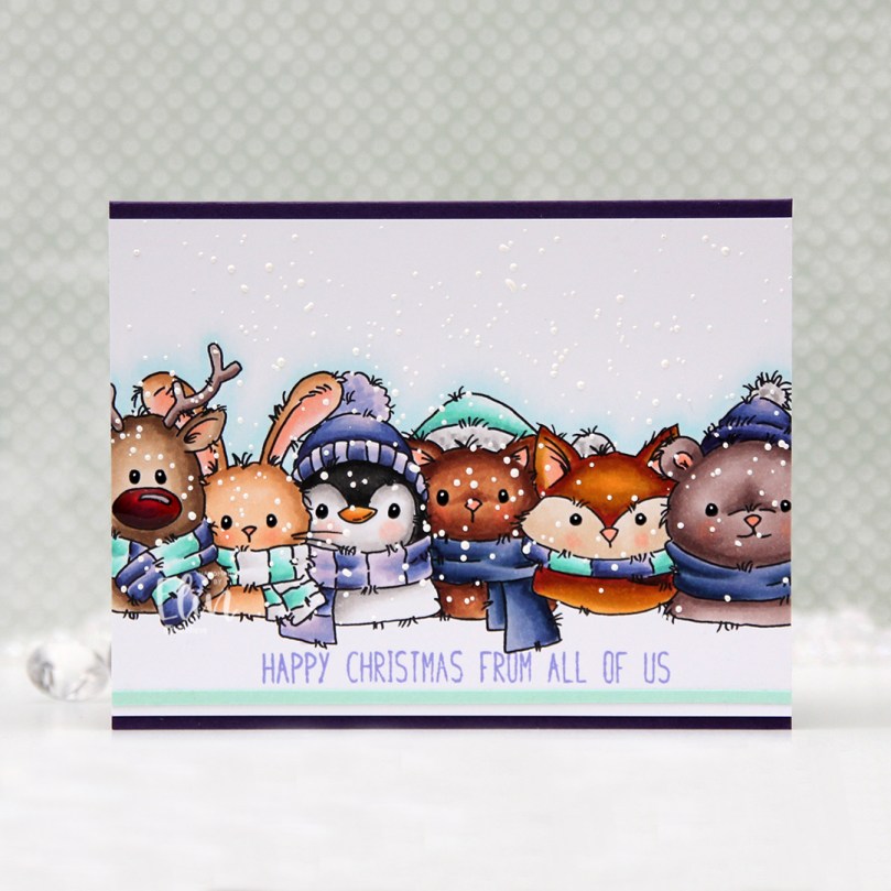 After I finished my coloring, I stamped and white heat embossed a sentiment in the sky. The sentiment is actually from the Scripty Xmas stamp set from Mama Elephant, I kind of forgot for a second that I was creating a Purple Onion card, I was a little lost in a creative zone. After heat embossing the sentiment, I sprinkled on chunky white embossing enamel from Stampendous to create my super snowy scene, making sure to remove any granules that landed on top of the embossed letters before melting the granules from the back.