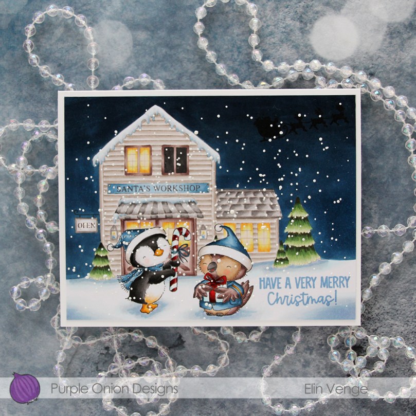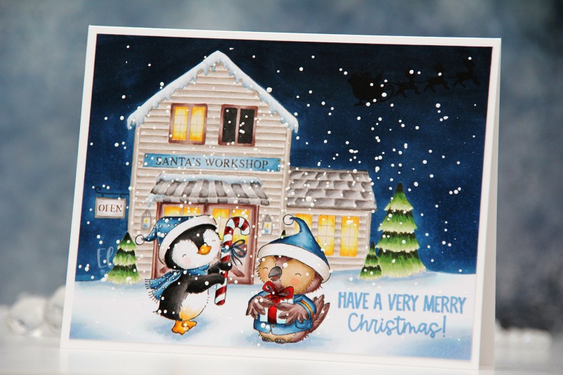 Winter and Balsam from the latest Christmas release from Stacey Yacula are exchanging gifts. They both look pretty happy to be out in the snow in front of Santa’s workshop. I snuck in the Santa silhouette in the sky and stamped a sentiment from the Santa Sentiments set in the snow.