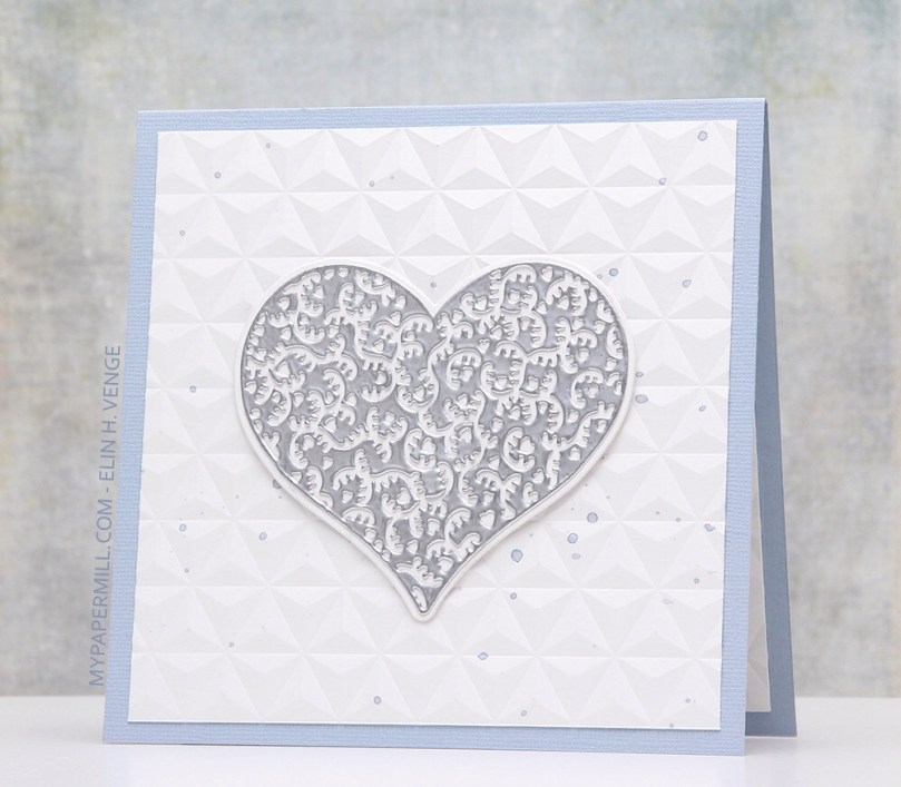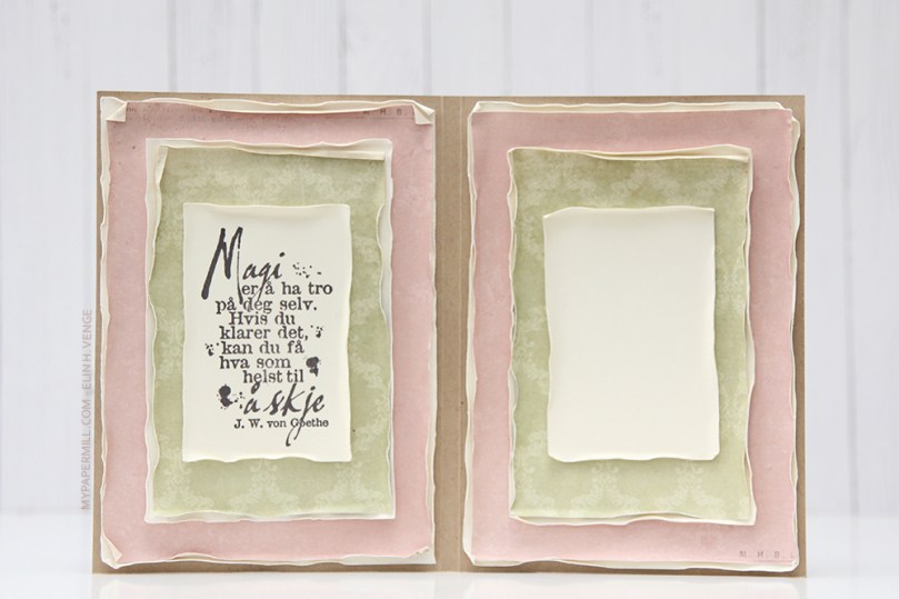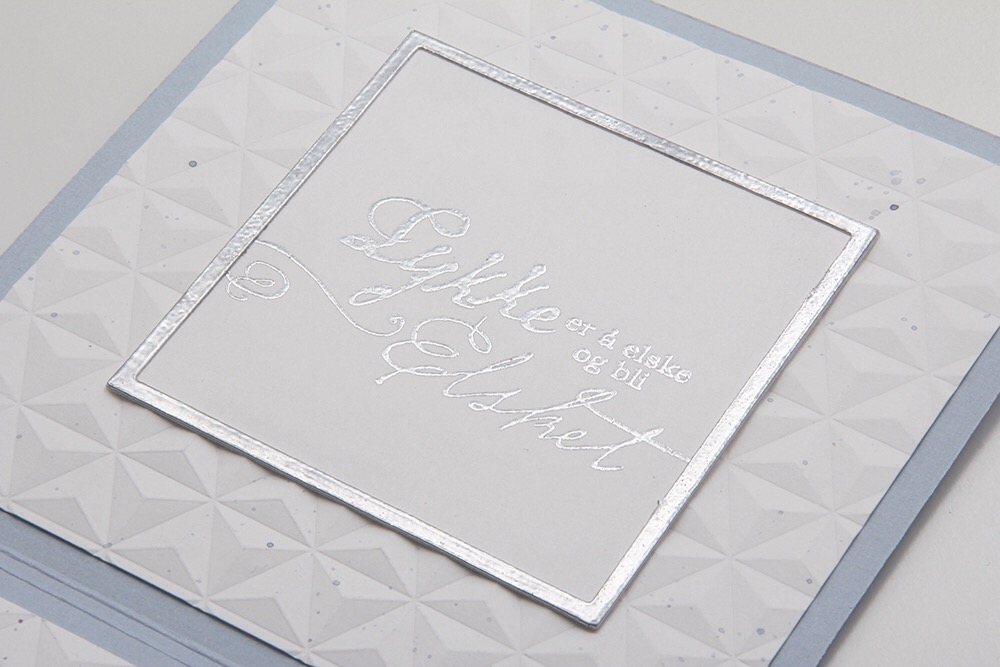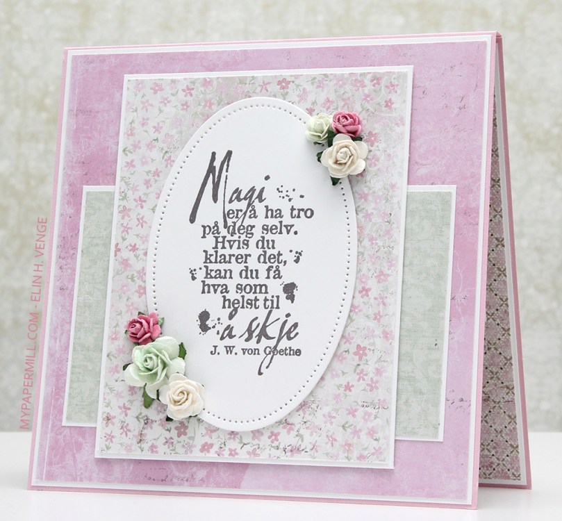 Som vanlig når jeg lager kort med GoKreate-dies har jeg byttet om på oppsettet av mønsterark på innsiden av kortet. Ved å gjøre det på denne måten går det akkurat med to mønsterark til et kort. Dieen er for stor til at man får fire paneler ut av ett mønsterark, men hvis man stanser ut i motsatte hjørner går det akkurat til at man får et kvadrat igjen som man kan bruke på innsidene. Teksten her kommer også fra Norsk Stempelblad AS.