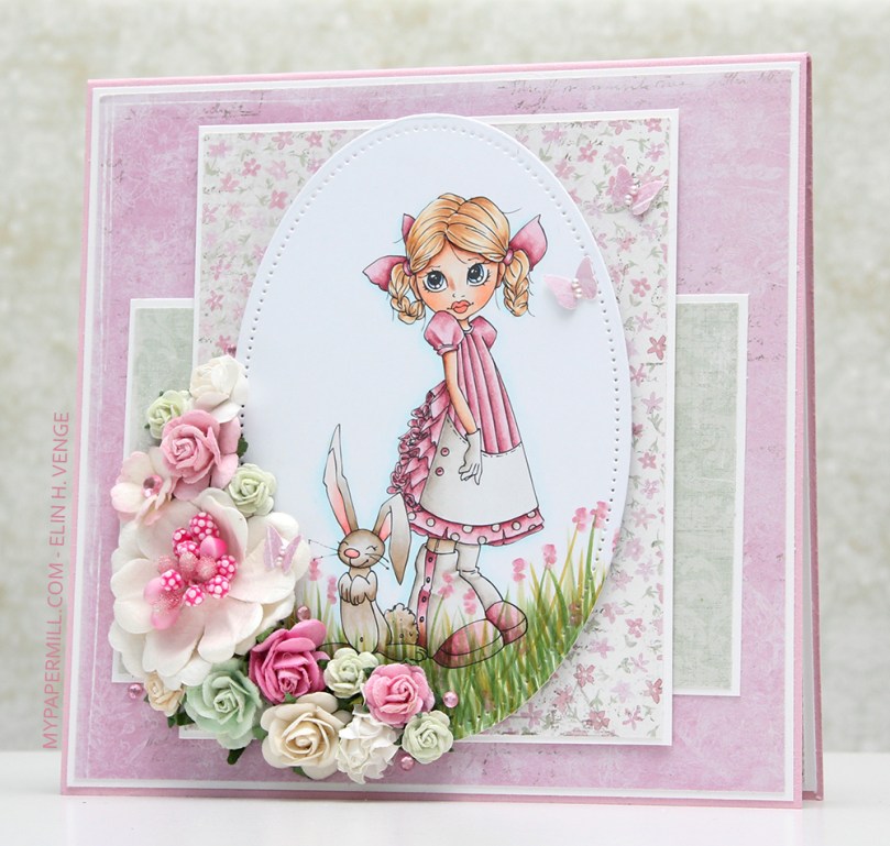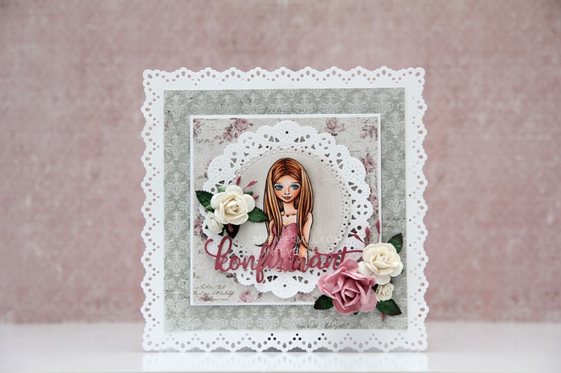 The pink I used for the dress matched perfectly with the roses in the Vintage Romance collection by Maja Design. I stacked white konfirmant diecuts on top of each other and finished off with a pink one on top colored with the darkest Copic I used for her dress. I’ve added dimension to pretty much all the panels, and a few flowers to embellish a little.