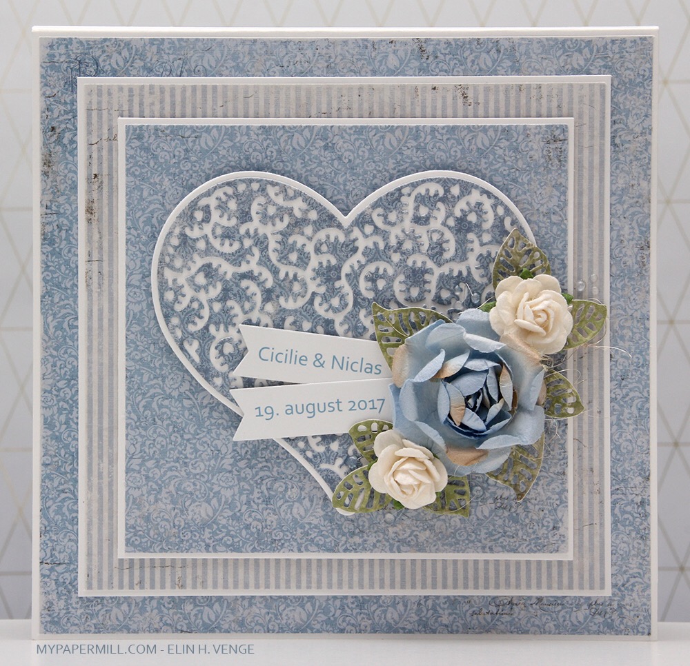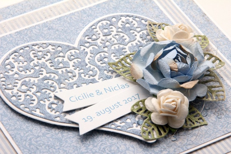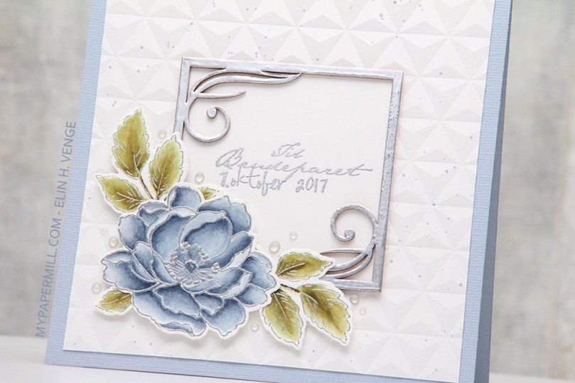 Selve formen på kortet er stanset ut med en die fra XXL Square Frames Frilly #10-settet til GoKreate. Jeg har pyntet med blomster fra Wild Orchid Crafts og North Star Design, samt bling fra Kort & Godt, både løs og i midten av de minste blomstene.