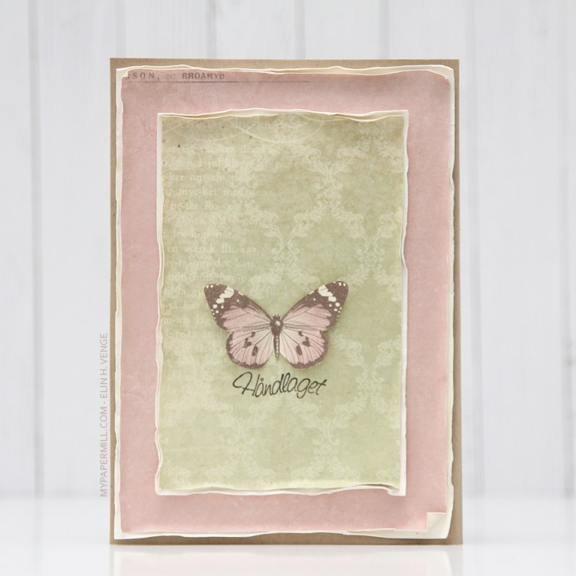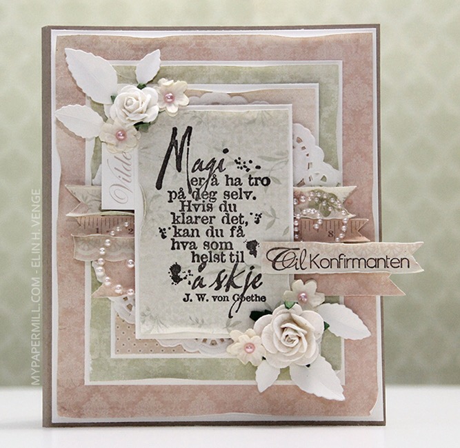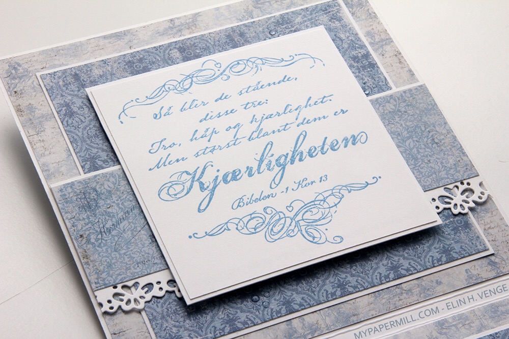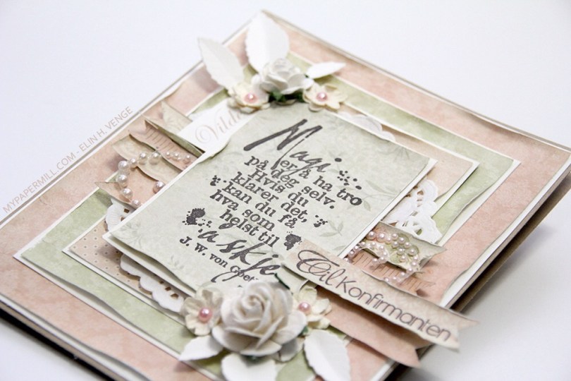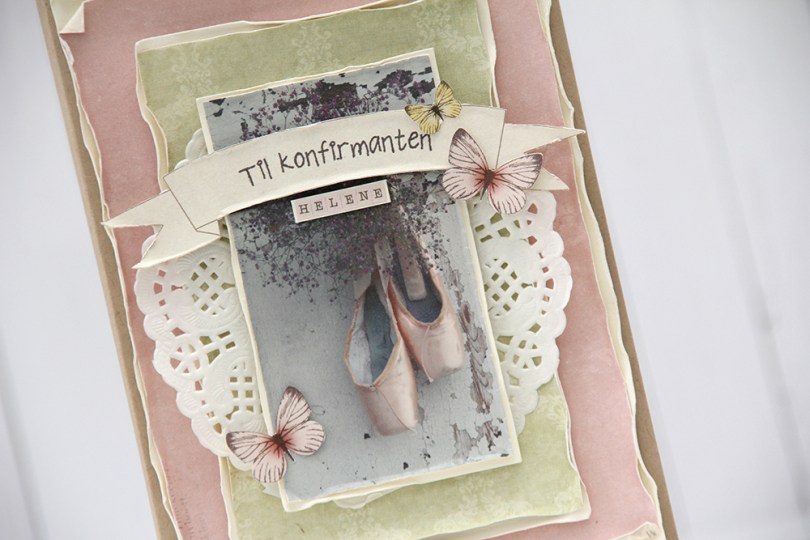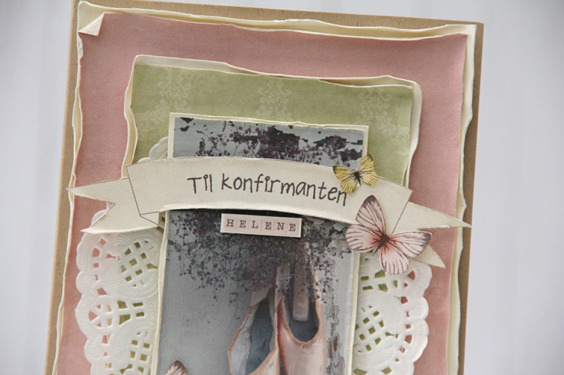 Til konfirmanten is a stamp from Norsk Stempelblad AS. I stamped it using Espresso Truffle ink from Memento, I didn’t want it to be stark black, and that ink is a nice mix of grey and brown that I really like. I used some tiny letter stickers from Kaisercraft to add the girl’s name below the banner, and fussy cut a few butterflies from one of the patterned papers and glued them on.
