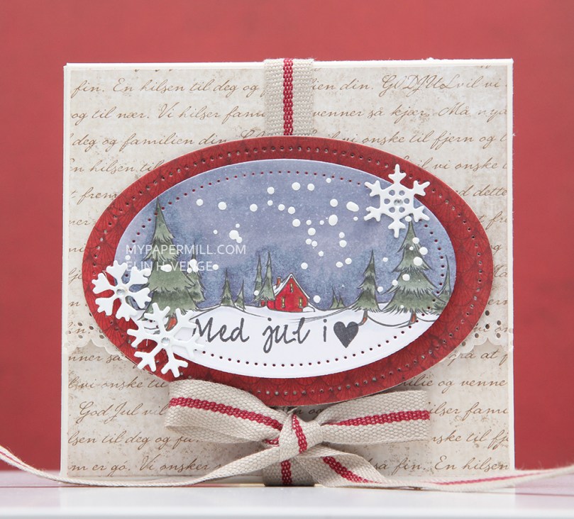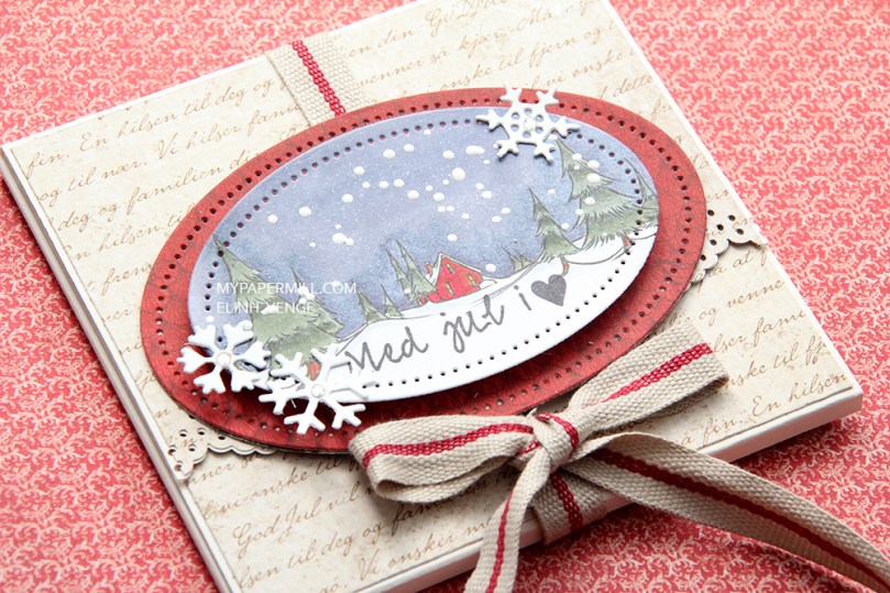 Inni lommen på venstresiden har jeg laget et enkelt skrivefelt. Jeg har delvis stanset ut en oval die på toppen for å få litt sammenheng med resten av kortet, og annengangsstemplet noen snøfnugg med Memento Espresso Truffle.