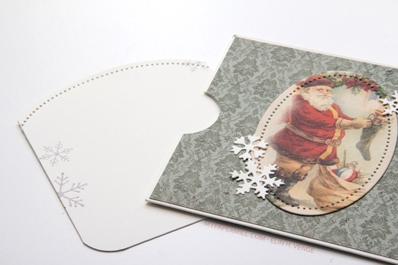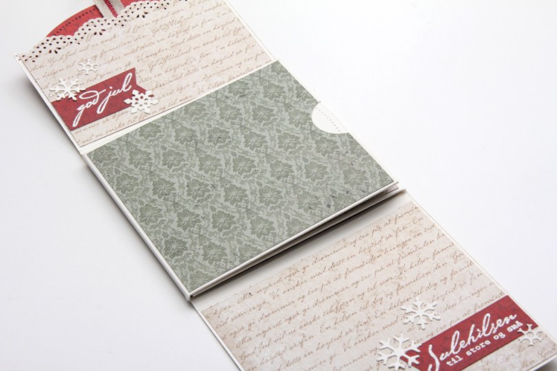 Bretter man det grønne panelet (som egentlig er en lomme) til side, finner man nok et grønt panel å brette til motsatt side, og da vises to nisser på de grønne mønsterarkene og hovedhilsenen fra Stempelglede embosset på det røde mønsterarket, inni en diecut laget med en die fra Memory Box. Nissene kommer fra et utklippsark fra Pion Design, og jeg har brukt en die fra Papirdesign til å lage ovaler av dem. Flere snøfnugg også her.