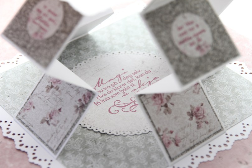 When you pull on the front of the card, there’s a neat little suprise behind it, four accordian folded “walls”, one on each side. I stamped confirmation sentiments from Norsk Stempelblad AS in Papertrey Ink Autumn Rose ink on punched circles of patterned paper and added them to my accordian folds.