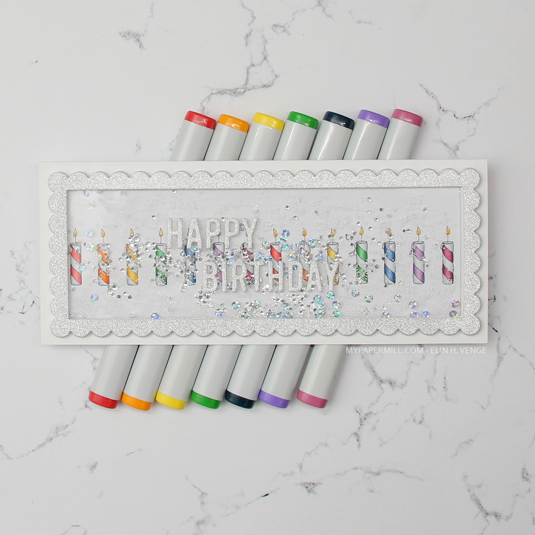 I colored in the candles using a rainbow color palette. Using the largest die in the Slimline Scallop Frame die set from Simon Says Stamp, I die cut six frames from white card stock and glued them together in a stack to form the walls for my shaker card. Into the shaker, I put some micro beads, some flat, iridescent sequins and quite a few “diamonds” from Kort & Godt, before adding a piece of acetate to seal the shaker. I die cut one last scallop frame to put on top, this time from a super glittery silver card stock from Kort & Godt. It’s very sparkly, and the glitter doesn’t rub off, I love it. I die cut Happy birthday from the same cardstock and adhered the letters onto the acetate to finish the card.