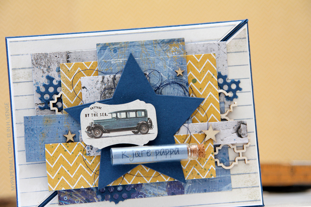 Jeg har også limt på noen stjerner fra Studio Calico. Stjernetemaet blir hentet opp igjen av den store blå stjernen, som fungerer som bakgrunn for den lille bilen og glassrøret med den stemplede teksten.