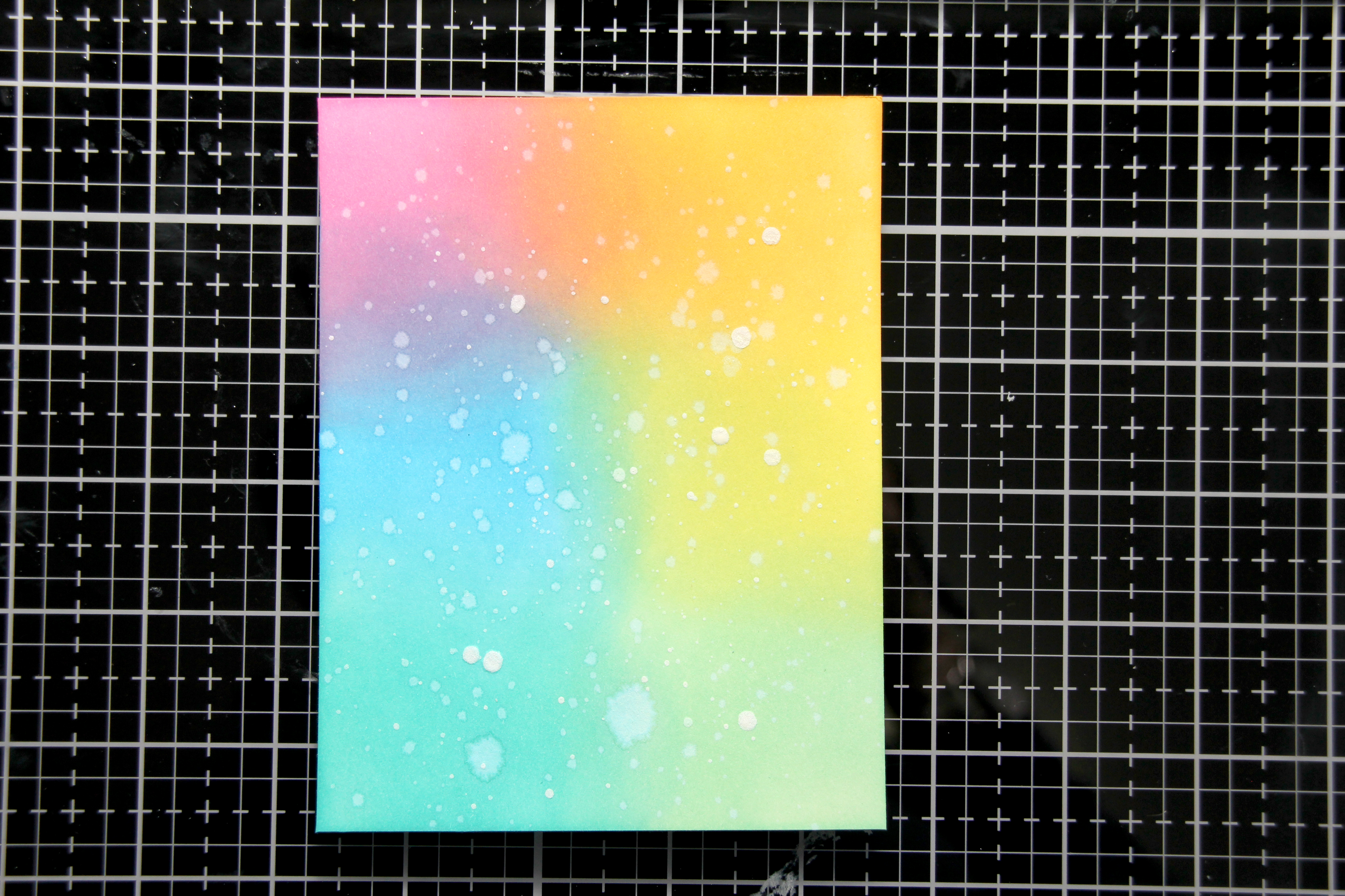 Speaking of backgrounds – I ink blended Distress Oxide Inks (Peacock Feathers, Cracked Pistachio, Twisted Citron, Fossilized Amber, Picked Raspberry and Salty Ocean) across a quarter sheet of Stamper’s Select White cardstock from Papertrey Ink. I heat set the panel to make sure it was dry, before running it through my printer to add the sentiment.