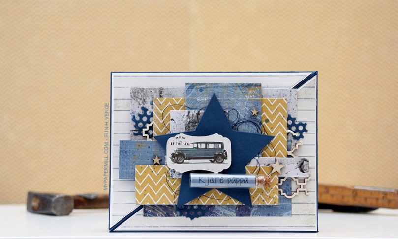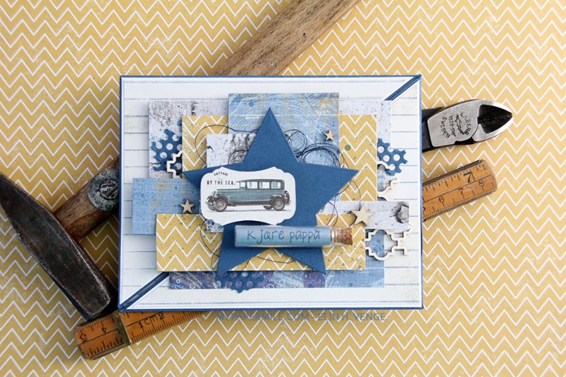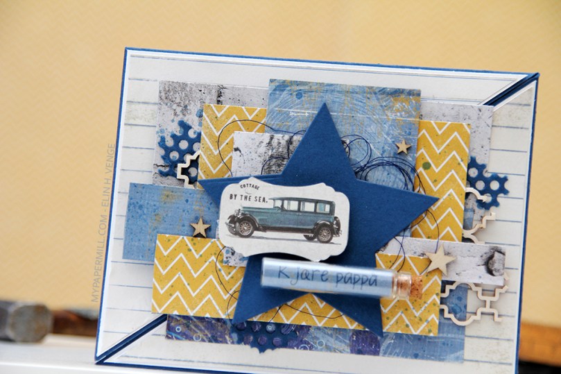 Jeg har også limt på noen stjerner fra Studio Calico. Stjernetemaet blir hentet opp igjen av den store blå stjernen, som fungerer som bakgrunn for den lille bilen og glassrøret med den stemplede teksten.