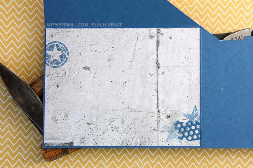 Kortets innside tar igjen elementer fra forsiden, både med betongarket fra Julehilsen-kolleksjonen til Papirdesign, det lille utstansede hullmønsteret og flere stjerner. Her er stjernene i stempelvariant fra Stampers Anonymous (Tim Holtz), stemplet i den samme blå blekkfargen (Enchanted Evening fra Papertrey Ink) som jeg brukte på stempelet i glassflasken på forsiden. Fargen matcher også kartongen. Den ene stjernen er generasjonsstemplet for et litt svakere uttrykk.