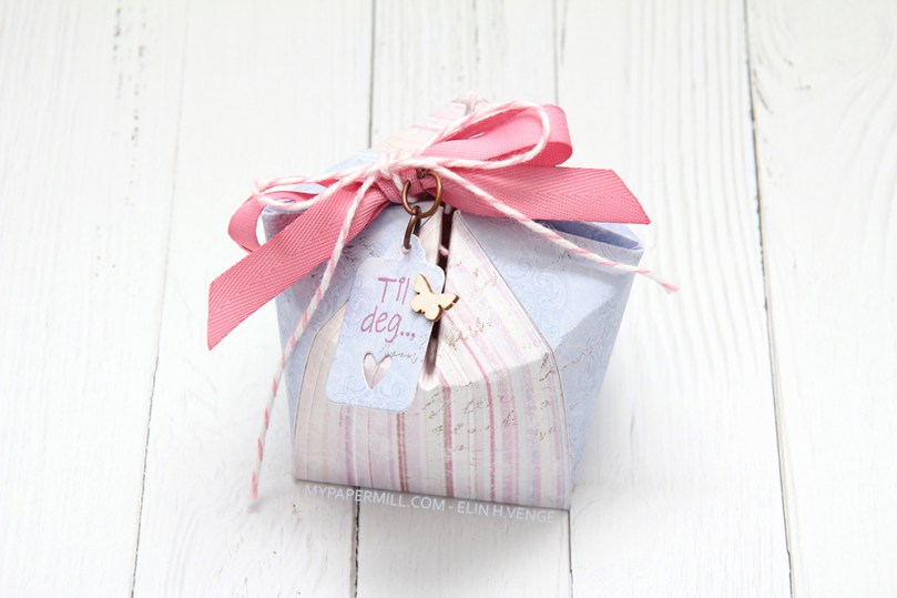 Esken er laget etter brettemal som du finner i februarbladet, og jeg har pyntet den veldig enkelt med bånd fra Papertrey Ink i samme farge som stempelputen, litt rosa twine, en liten tag stanset ut med en die fra Papertrey Ink med en bitteliten stemplet tekst fra Norsk Stempelblad AS og en liten sommerfugl.