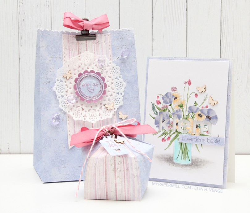 Jeg har brukt ark fra Sofiero-kolleksjonen til Maja Design på alle tre prosjektene mine. På papirposen har jeg brukt dies fra Rayher til å lage vimpelen og kanten øverst på posen. En minikakeserviett fra Doodlebug fungerer som pynt på forsiden, og jeg har stemplet et lite stempel fra Papirdesign med Papertrey Ink Autumn Rose blekk og satt på en pebble fra Norsk Stempelblad AS. Jeg har også lurt en krystallgren på undersiden og pyntet veldig enkelt med noen sommerfugler fra Wycinanka.